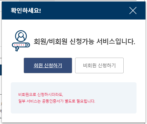 신청하기 버튼을 클릭하면 두가지 신청하기 버튼이 나오는데 회원이면 왼쪽, 비회원이면 오른쪽 버튼을 클릭하면 됩니다.