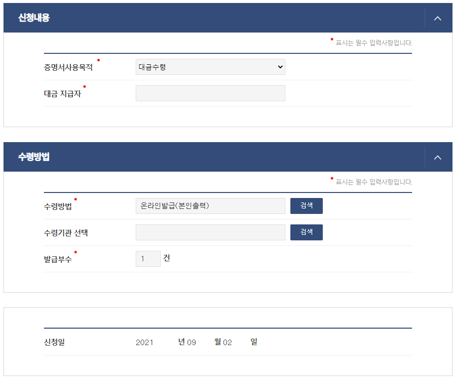 그리고 신청내용에서 증명서 사용목적을 선택하여야 하는데 해외 이주로 증명서를 발급받으려는 경우 해외 이주 허가번호, 해외 이주 허가일을 입력하여야 합니다. 그리고 자동적으로 수령방법은 온라인발급으로 되어 있으니 따로 선택하지 않으셔도 되고 발급부수는 필요한만큼 입력하시면 됩니다.