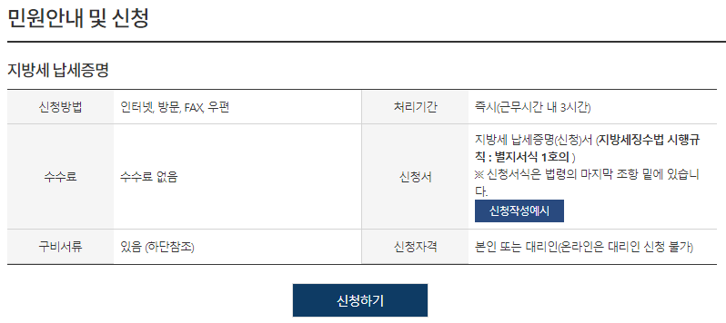 지방세완납증명서 인터넷발급 수수료는 없으며 신청을 하려면 아래쪽에 신청하기 버튼을 클릭하시면 됩니다.