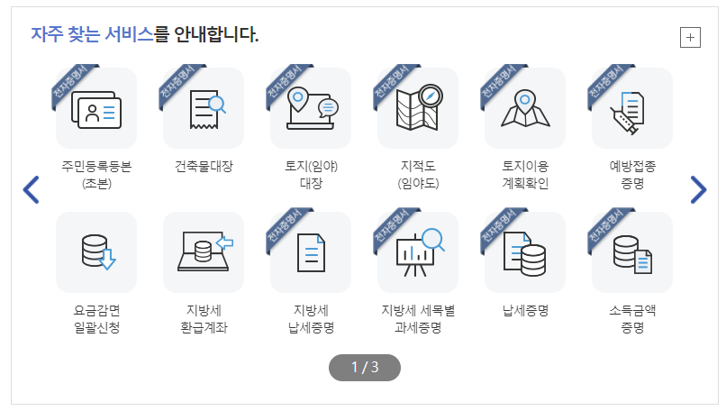 자주 찾는 서비스 아래쪽을 보시면 전자증명서 지방세 납세증명이 보일 것입니다.