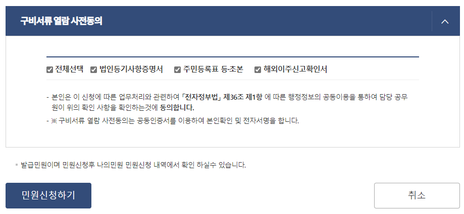 마지막으로 지방세완납증명서 인터넷발급 신청을 하려면 담당 공무원이 열람할 수 있도록 사전 동의를 하여야 하는데 자동적으로 체크되어 있으니 바로 민원 신청하기 버튼을 클릭하시면 됩니다.