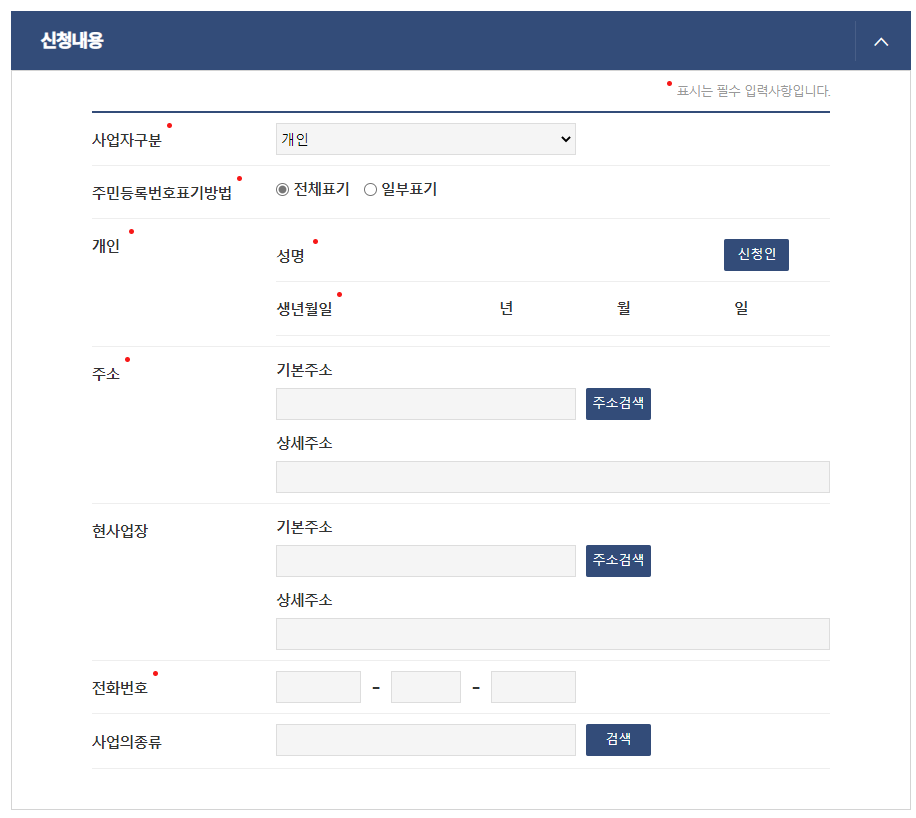 사업자 구분, 주소, 전화번호, 사업의 정류, 현 사업장 주소등을 입력 선택하시면 됩니다.