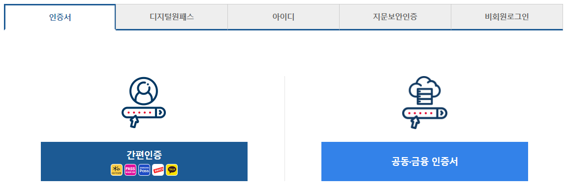 간편인증서를 이용하거나 공동, 금융인증서를 이용하시면 됩니다.