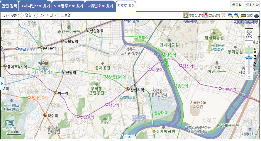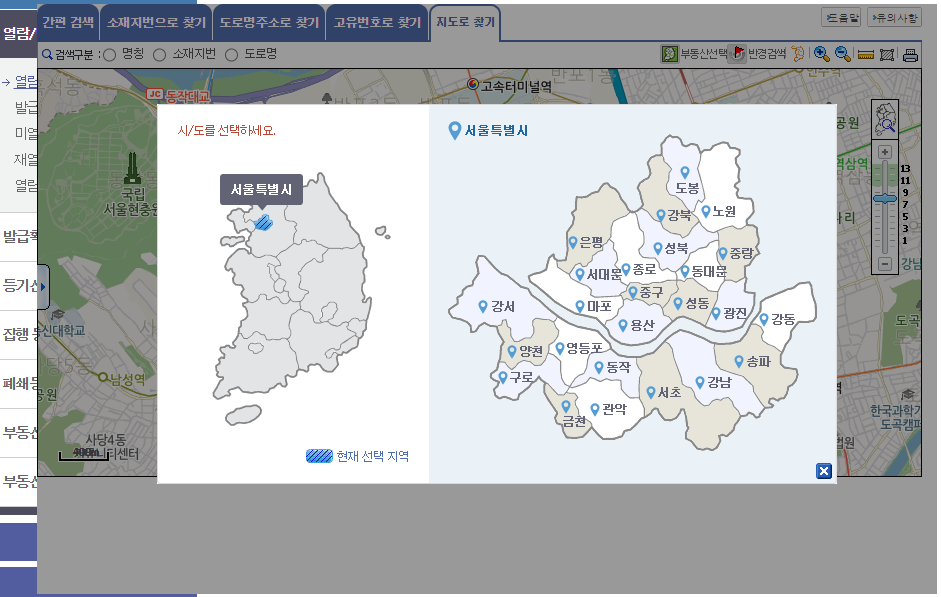 지도로 찾기를 클릭하면 지도가 열리게 되고 서울특별시가 처음으로 보입니다.