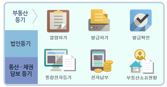 등기열람/발급, 등기신청, 전자납부, 확정일자 등이 보입니다.