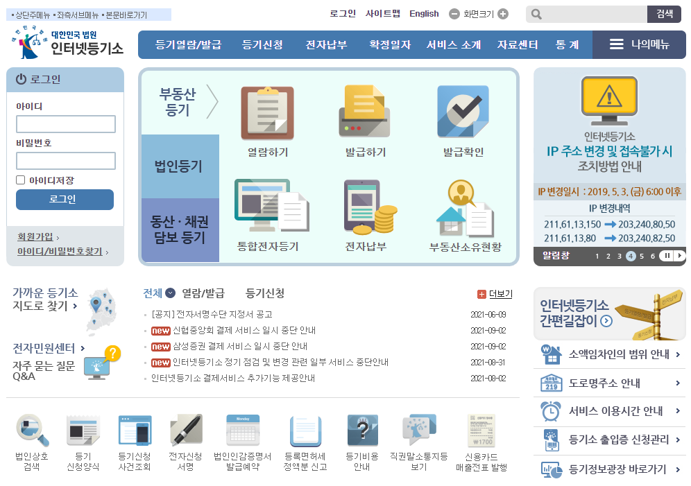 대법원 인터넷등기소에서는 부동산 등기를 열람할 수 있습니다. 부동산 등기가 무엇인지 설명해 드리자면 부동산의 경우 누가 이것을 소유하고 있는지 알기가 어렵기 때문에 국가에서 등기부라는 장부를 만들어 놓고 그 부동산에 대한 권리 관계를 명확히 하여 일반인들이 알 수 있도록 한 것입니다. 대법원 인터넷등기소 홈페이지에서 부동산 등기부 열람을 해보신 분은 아시겠지만 열람한 부동산의 지번, 지목, 구조, 면적 등의 부동산의 표시사항과 소유권, 지상권, 저당권, 전세권, 가압류 등의 권리관계를 상세하게 확인하실 수 있습니다. 부동산 등기부에는 부동산에 관한 상세한 내용이 나와 있기 때문에 부동산을 매매 할 때 꼭 확인해야하는 문서이며 혹시나 확인을 안할 경우 여러가지 불상사가 생길 수가 있으니 꼭 확인을 하시기 바랍니다. 뉴스를 보시면 아시겠지만 정말 큰 손해를 입으실 수가 있습니다. 물론 확인을 한다고 하여 모든 것들을 예방할 수 있는 것은 아니겠지만 그래도 예방하는데 많은 도움이 될것입니다.