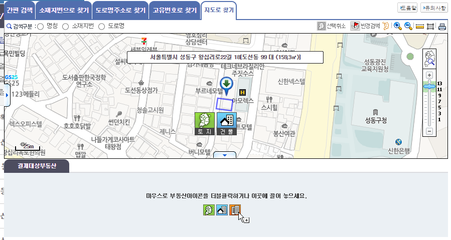 여기서 부동산을 선택하시면 등기부를 열람해보실 수 있습니다. 부동산을 선택하려면 지도 오른쪽 상단에 있는 부동산 선택 버튼을 클릭하여야 합니다.