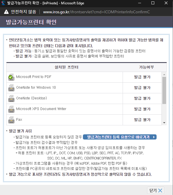 발급가능 프린터를 확인하신 후 발급을 받아야 합니다.