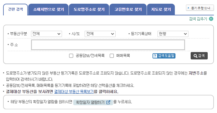 열람 메뉴를 클릭하시면 소재지번, 도로명, 고유번호, 지도로 찾는 검색창이 보입니다.