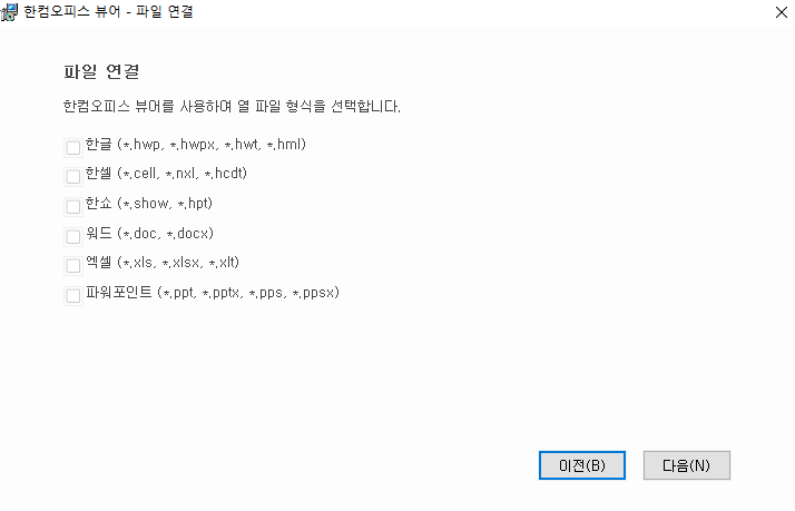 마지막으로 파일 연결을 하여야 하는데 한글, 한셀, 한쇼, 워드, 엑셀, 파워포인트 등 열 파열형식을 선택한 후 다음 버튼을 클릭하면 hwp 뷰어 설치가 시작됩니다. 설치는 금방 되는데 설치 시간은 10초도 걸리지 않았습니다.
