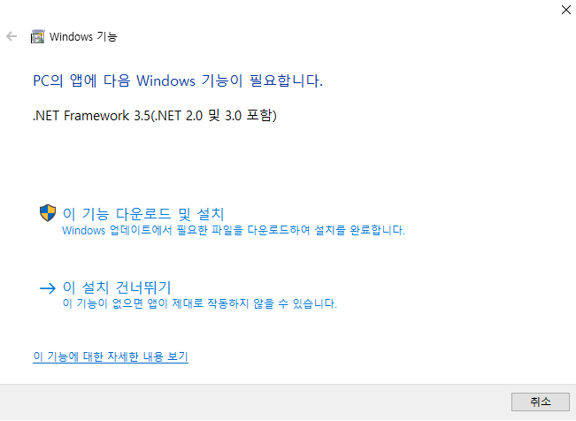 제 컴퓨터의 경우 NET Framework 3.5 프로그램을 설치하라느 창이 열렸는데 원활하게 사용하려면 설치를 하라고 하니 설치를 하였습니다.