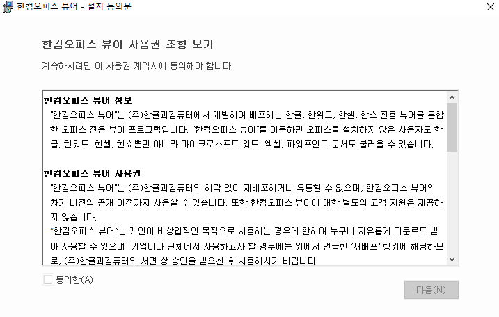 hwp 뷰어 설치를 하려면 동의함에 체크를 하신 후 다음으로 넘어가시기 바랍니다.