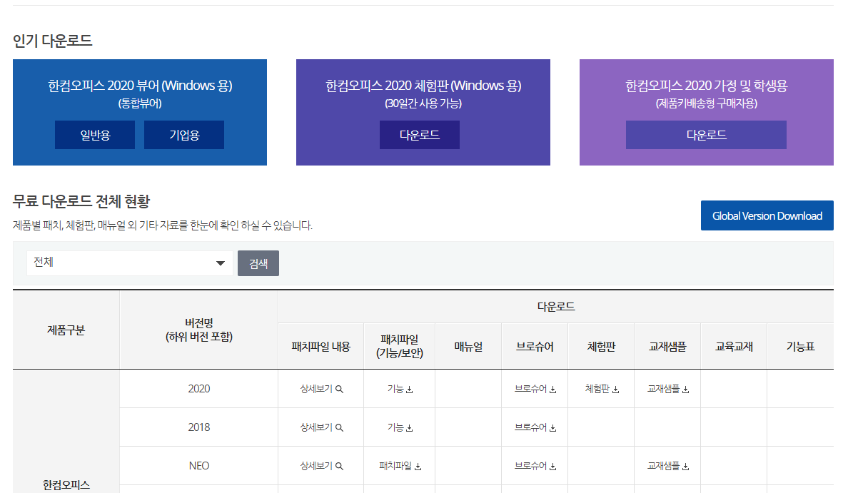 상단을 보시면 인기 다운로드가 보이고 그 중에서 왼쪽편을 보시면 한컴오피스 2020뷰어 윈도우용이 있습니다.