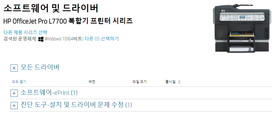 제출 버튼을 클릭하면 위 화면처럼 검색한 제품명의 프린터가 보이고 아래쪽에는 프린터 드라이버가 보입니다.