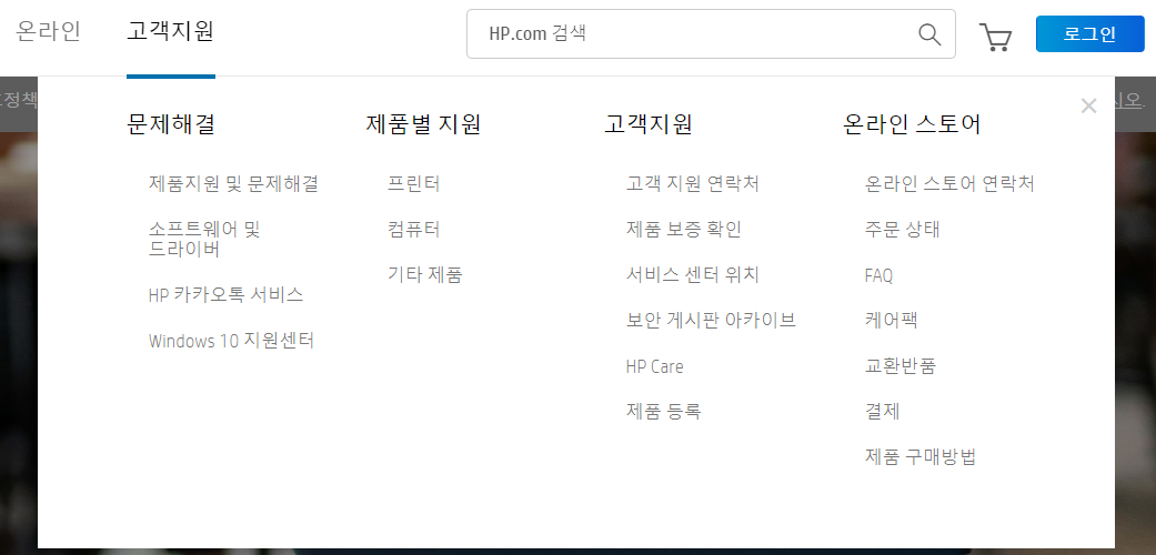 고객지원 메뉴에는 문제 해결, 제품별 지원, 고객지원 등이 있는데 왼쪽에 있는 문제해결을 보시기 바랍니다.