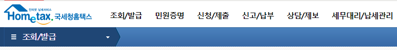 맨 왼쪽에 조회/발급 메뉴가 있는데 조회/발급 메뉴를 클릭하시기 바랍니다.