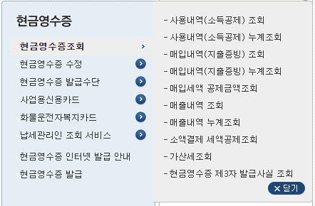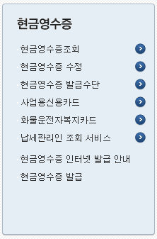 아래쪽을 보시면 현금영수증이라고 되어 있고 현금영수증 조회, 현금 영수증 수정, 현금영수증 발급수단, 현금영수증 발급 등의 메뉴들이 있습니다.