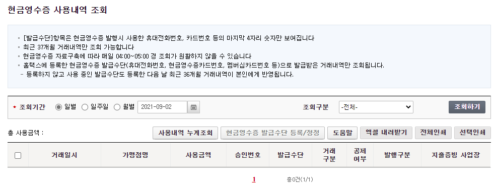 조회기간을 설정하신 후 조회하기 버튼을 클릭하시면 선택한 기간 동안의 현금영수증 내역을 확인하실 수 있습니다.