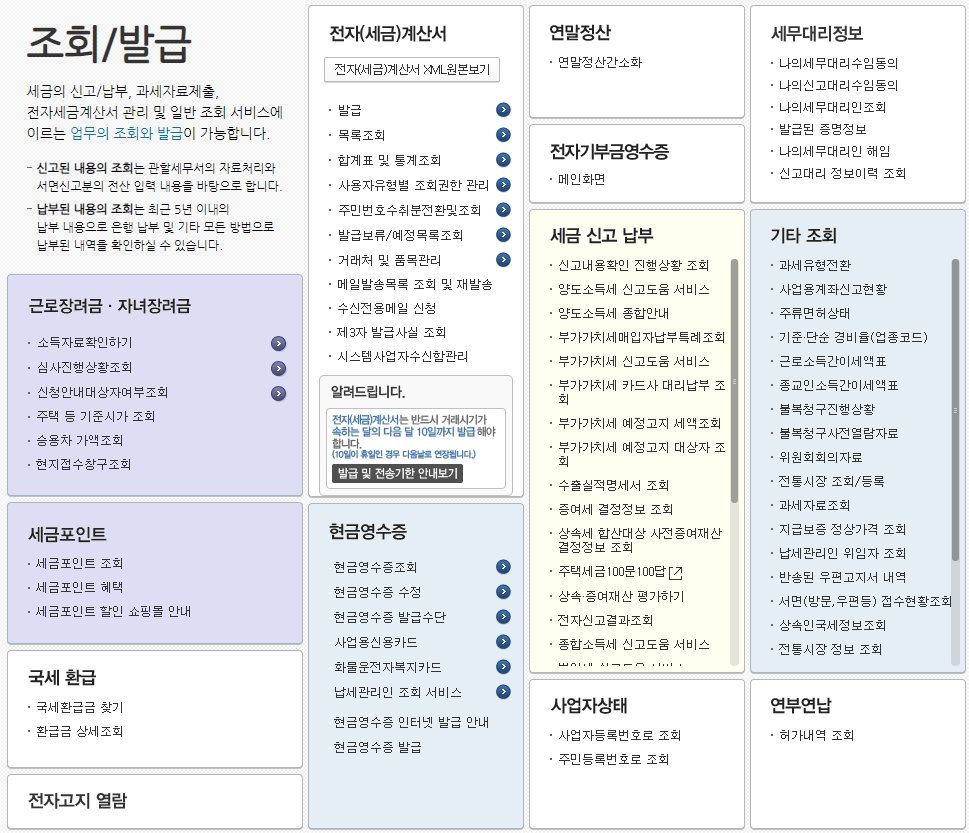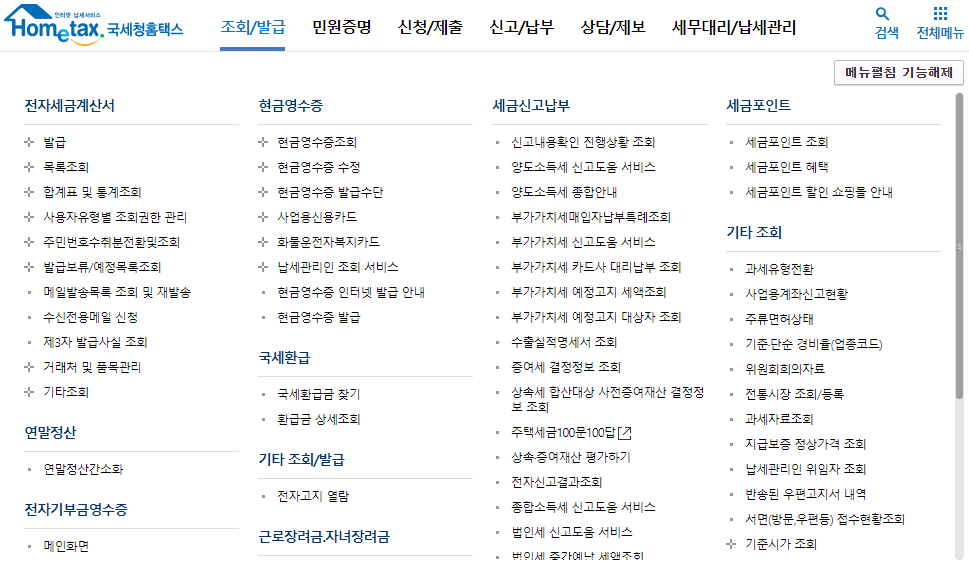 조회/발급 메뉴를 클릭하면 국세청 홈택스에서 할 수 있는 모든 조회/발급 서비스들이 보입니다.