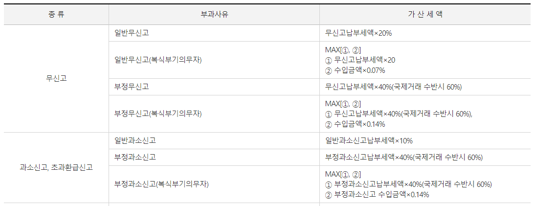마지막으로 세액이 증가할 수도 있는데 무신고를 하거나, 부정 무신고를 하거나, 과소신고를 할 경우 납부세액의 10%에서 40%까지 가산세가 부과될 수 있습니다.
