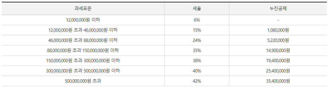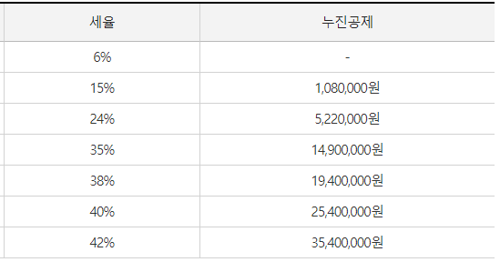 15% 세율은 1,080,000원, 24% 세율은 5,220,000원, 35% 세율은 14,900,000원, 38% 세율은 19,400,000원, 40% 세율은 25,400,000원, 42% 세율은 35,400,000원이라고 되어있습니다.