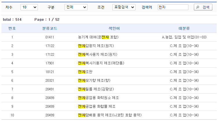 마지막으로 검색란에 검색어를 입력하시고 검색 버튼을 클릭하시면 이렇게 한국표준산업분류업종코드 조회가 됩니다.