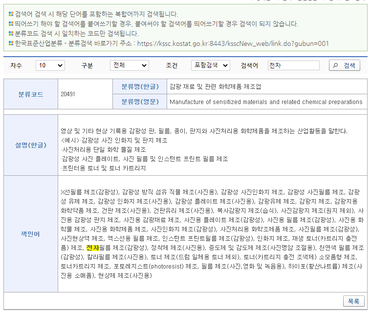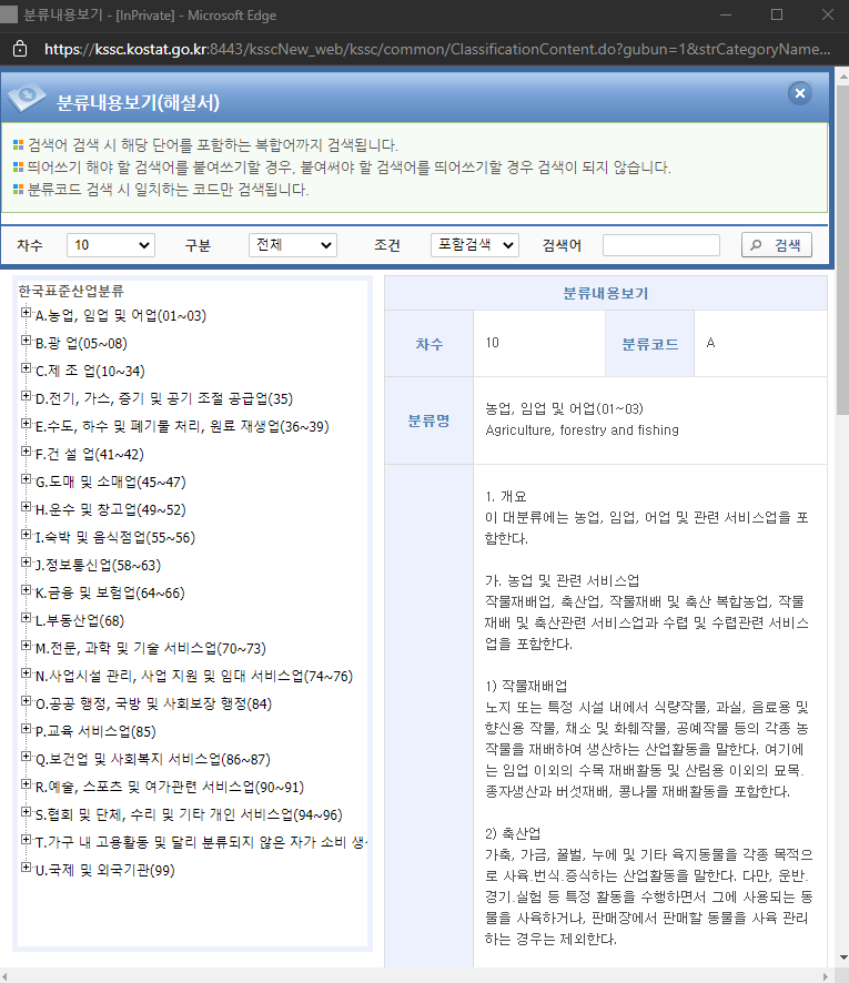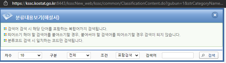 검색된 분류 코드를 클릭하시면 이렇게 분류명, 설명, 색인어를 상세하게 확인하실 수 있습니다.