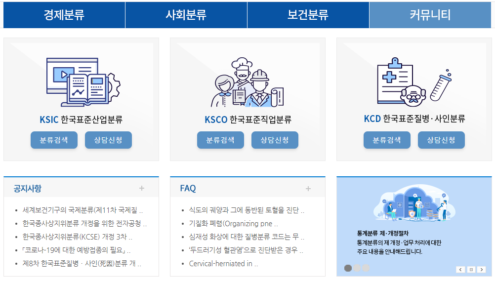 홈페이지에 접속하시면 한극표준 산업분류, 한국표준 직업분류, 한국표주질병 분류가 보입니다.