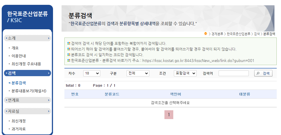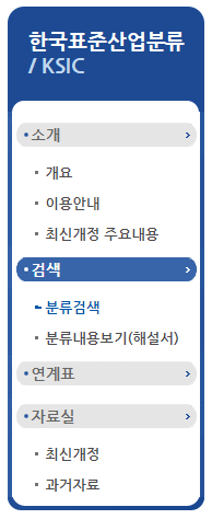 왼쪽편에 환극표준산업분류 분류 검색버튼을 클릭하시면 한국표준산업분류업종코드 조회를 하실 수 있습니다.