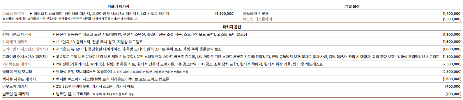 선택품목에는 파퓰러 패키지, 개별옵션이 있습니다. 파퓰러 패키지는 헤드업 디스플레이, 하이테크 패키지, 드라이빙 어시스턴스 패키지Ⅰ, 2열 컴포트 패키지를 말하고 개별옵션에는 파노라마 선루프, 헤드업 디스플레이가 있습니다.