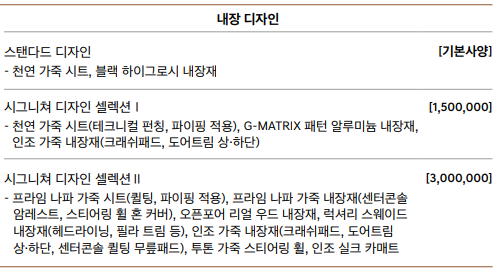 스탠다드 디자인은 천연 가죽 시트, 블랙 하이그로시 내장재이며 시그니쳐 디자인 셀렉션Ⅰ은, 천연 가죽 시트(테크니컬 펀칭, 파이핑 적용), G-MATRIX 패턴 알루미늄 내장재, 인조 가죽 내장재(크래쉬패드, 도어트림 상·하단)로 1,500,000원입니다.