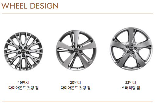 가솔린 3.5 터보는 265/50R20 미쉐린 타이어 & 다이아몬드 컷팅 휠이 기본이며 265/40R22 미쉐린 타이어 & 스퍼터링 휠을 선택할 수 있습니다.