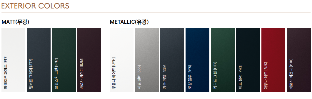 외장컬러는 기본 메탈릭 컬러 유광 8종 중 선택을 할 수 있고 매트컬러는 700,000원으로 무광 4종 마테호른 화이트 ,멜버른 그레이, 브런즈윅 그린, 바로사 버건디 중에서 선택할 수 있습니다.