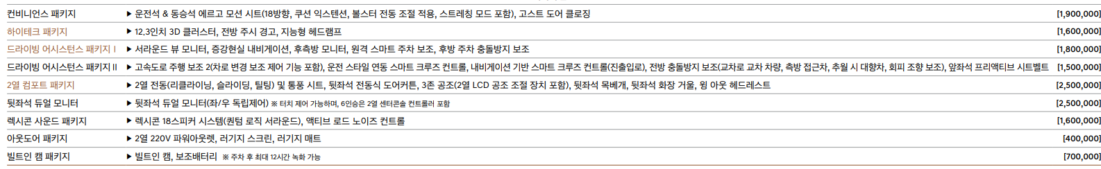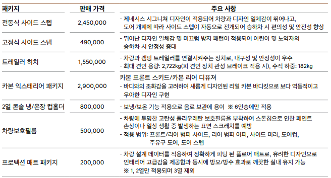 전동식 사이드 스텝, 고정식 사이드 스텝, 트레일러 히치, 카본 익스테리어 패키지, 2열 콘솔 냉/온장 컵홀더, 차량 보호필름, 프로텍션 매트 패키지가 있습니다.