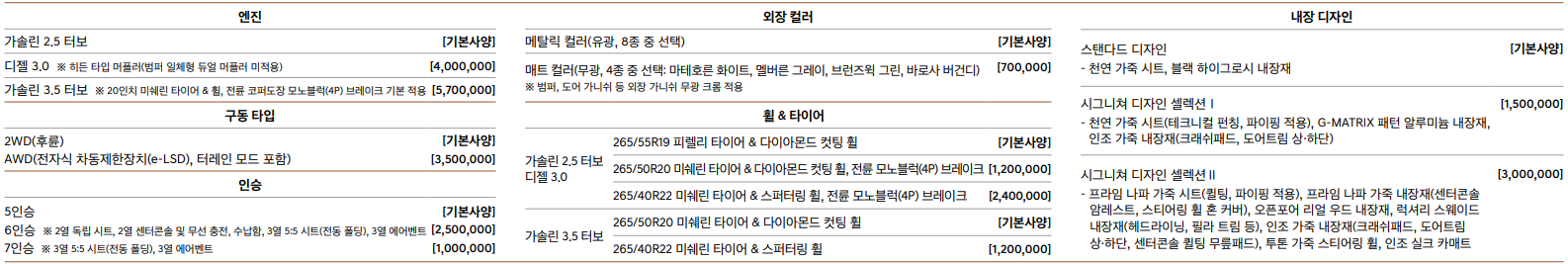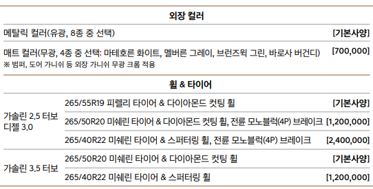 휠 & 타이어는 가솔린 2.5 터보, 디젤 3.0 기준 265/55R19 피렐리 타이어 & 다이아몬드 컷팅 휠이 기본이며 265/50R20 미쉐린 타이어 & 다이아몬드 컷팅 휠, 전륜 모노블럭(4P) 브레이크, 265/40R22 미쉐린 타이어 & 스퍼터링 휠, 전륜 모노블럭(4P) 브레이크를 선택할 수 있고 각각 1,200,000 , 2,400,000원입니다.