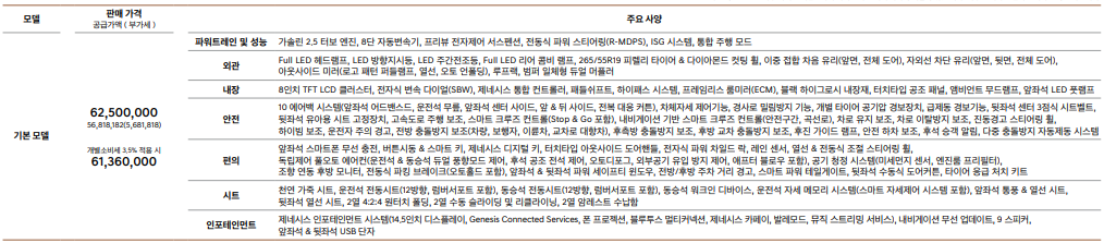 기본모델은 가솔린 2.5 터보엔진을 말하며 판매가격은 62,500,000원, 개별소비세 3.5% 적용시 61,360,000원,입니다.