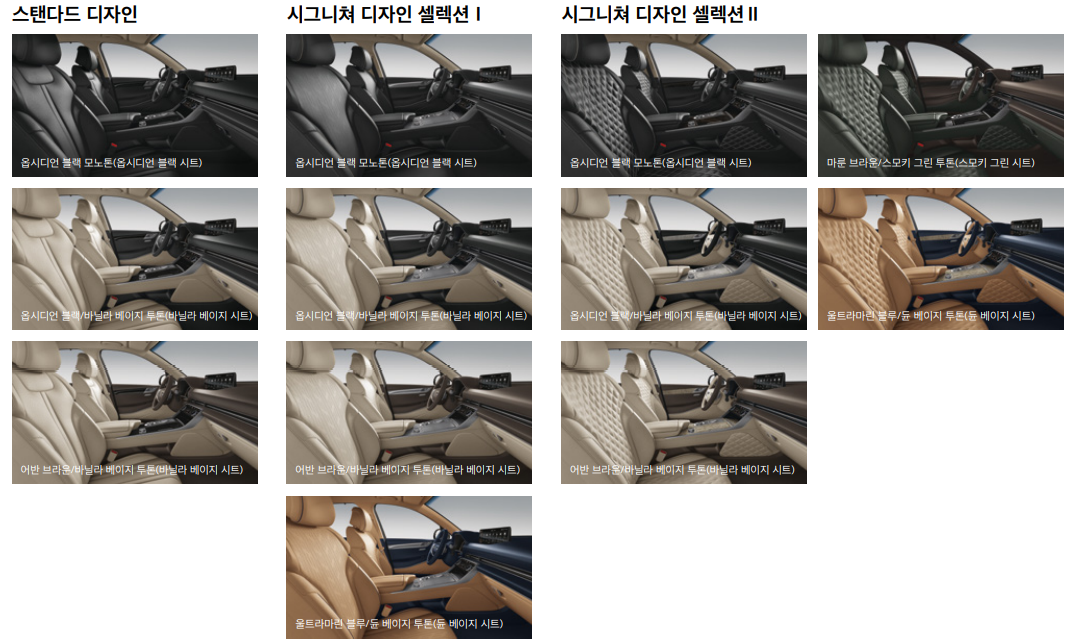 마지막으로 시그니쳐 디자인 셀렉션Ⅱ은 프라임 나파 가죽 시트(퀼팅, 파이핑 적용), 프라임 나파 가죽 내장재(센터콘솔, 암레스트, 스티어링 휠 혼 커버), 오픈포어 리얼 우드 내장재, 럭셔리 스웨이드, 내장재(헤드라이닝, 필라 트림 등), 인조 가죽 내장재(크래쉬패드, 도어트림, 상·하단, 센터콘솔 퀼팅 무릎패드), 투톤 가죽 스티어링 휠, 인조 실크 카매트로 3,000,000원입니다.