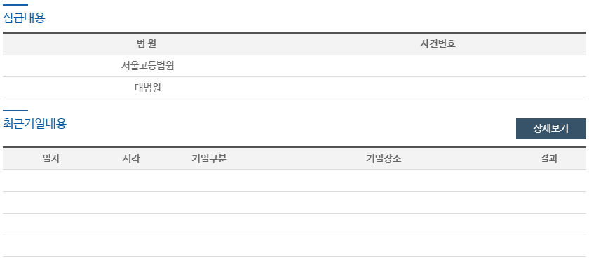 그리고 아래로 조금 내리시면 심금내용과 최근기일내용, 최근 제출서류 접수내용, 관련사건내용 등을 확인할 수 있습니다.