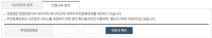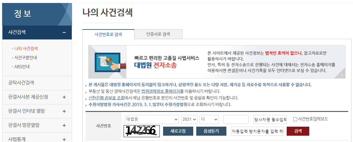 만약에 사건번호가 기억이 나지 않는 분들은 인증서를 이용해서 검색을 하시면 됩니다.
