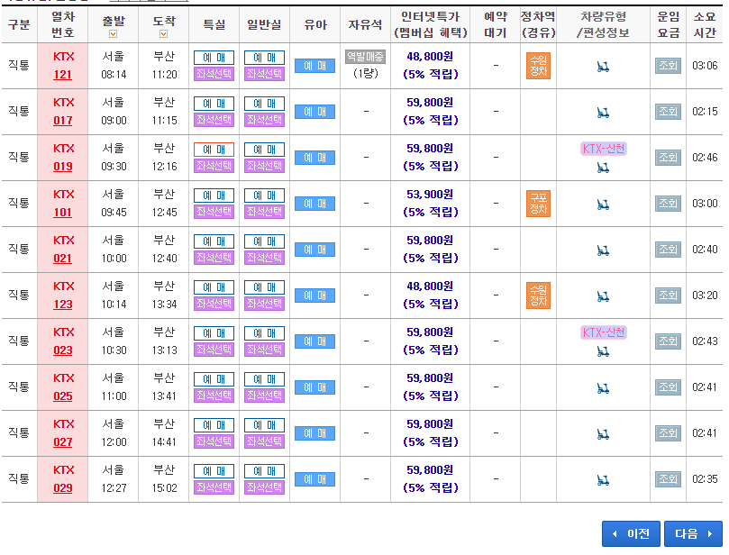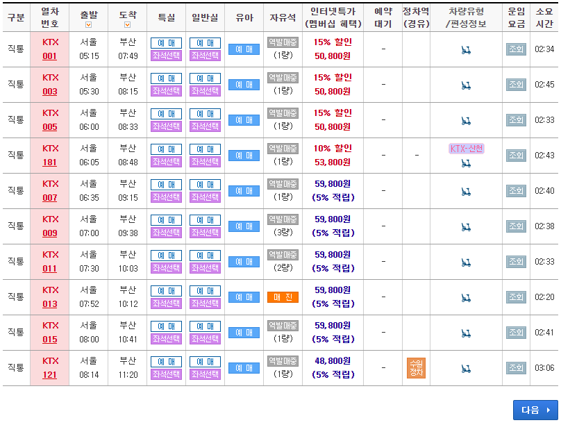 그리고 시간표 아래쪽을 보시면 다음 버튼이 보이실텐데 다음 버튼을 클릭하시면 8시 14분 이후 ktx 시간을 확인하실 수 있습니다.