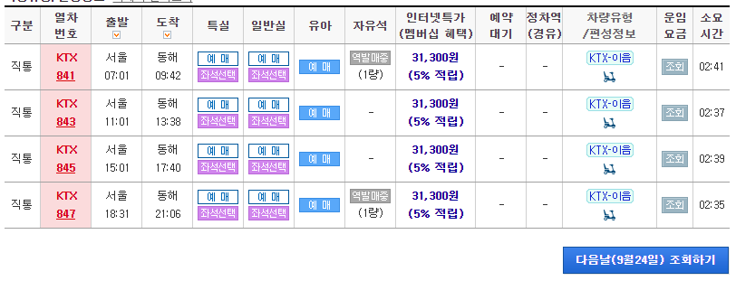 서울에서 동해로 가는 KTX 열차 시간표 조회를 해보았습니다.