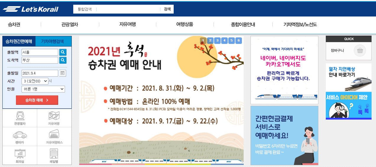 홈페이지 왼쪾편을 보면 승차권 간편예매 메뉴가 보일 것입니다.