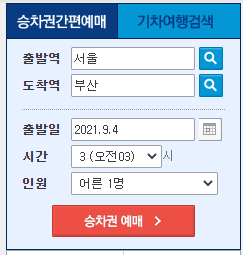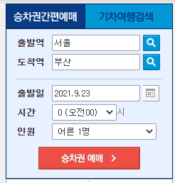 출발역은 서울, 도착역은 부산, 출발일은 2021년 9월 23일로 선택하였고 선택을 하였으면 승차권 예매 버튼을 클릭하시기 바랍니다.