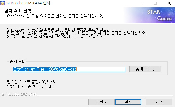 마지막으로 설치폴더를 선태하게 되는데 설치 폴더를 설정 후 설치 버튼을 클릭하시면 곰플레이어 통합코덱설치가 완료됩니다.