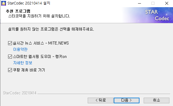 다음으로 넘어가시면 설치를 원하지 않는 프로그램을 선택하게 됩니다. 전부 해제를 하신 후 다음으로 넘어가야 합니다.