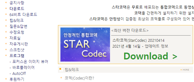 홈페이지에 접속하셔서 중앙르 보시면 통합코덱 다운로드 버튼이 보입니다.