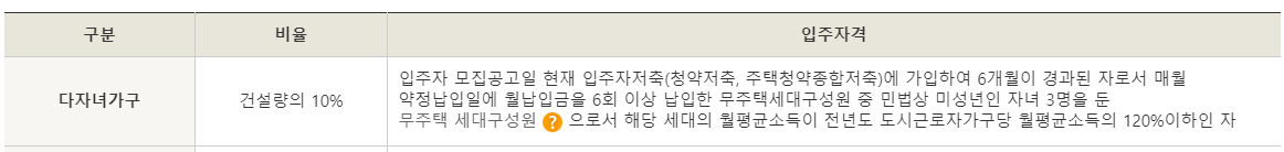 특별공급 중에서 다자녀 가구 입주조건은 입주자 저축기간이 6개월 경과된 자로서 매월 약정납입일에 6회 이상 납입한 무주택 세대구성원 중 민법상 미성년인 자녀 3명을 둔 무주택 세대 구성원으로서 월평균소득의 120% 이하인자입니다.