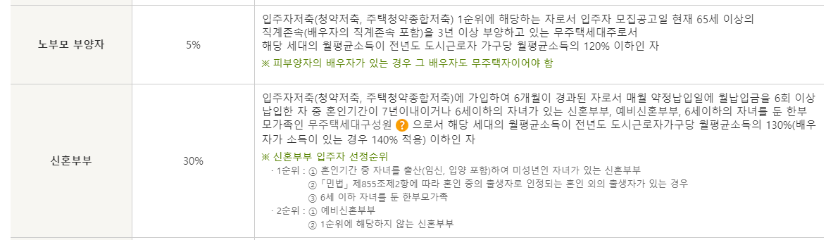 그리고 신혼부부는 저축기간으 6개월 경과된 자로서 6회 이상 납입한 자 중에서 혼인기간이 7년이내이거나 6세이하의 자녀가 있는 신혼부부, 예비신혼부부, 6세 이하의 자녀를 둔 한부모 가족인 무주택 세대 구성원으로서 월푱균 소득이 130% 이하인자입니다.(배우자 소득이 있는 경우 140%)