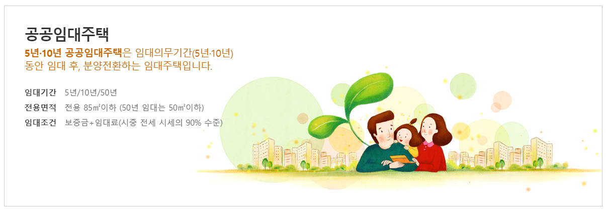 공공임대아파트는 임대의무기간이 5년, 10년 이며이며 임대 후 분양전환 되는 주택을 말합니다. 전용면적은 85 제곱미터 이하를 말합니다. 그리고 보시면 임대기간이 50년이라고도 되어 있는데 50년 공공임대주택은 영구적인 임대를 목적으로 건설한 임대주택으로 현재는 신규 공급이 없기때문에 예비입주자로만 신청가능하고 전용면적은 50제곱미터 이하입니다.