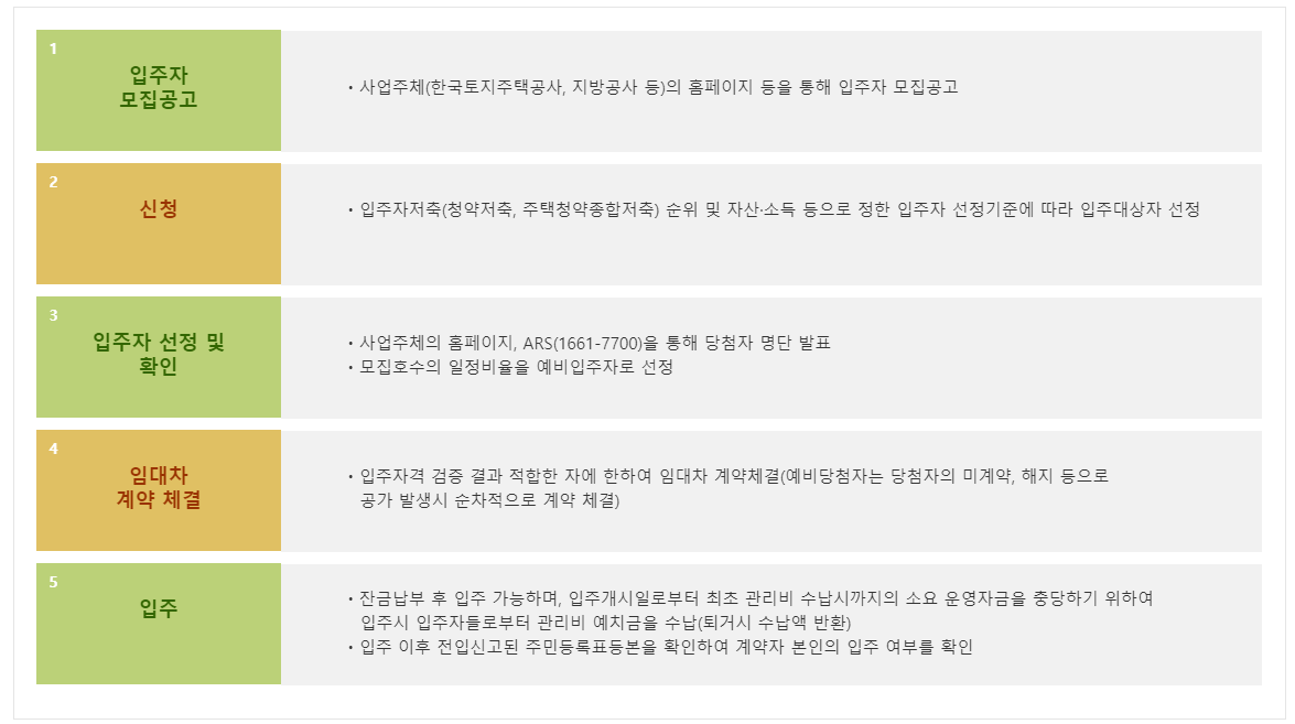 공공임대아파트 입주조건을 살펴보시고 해당한다면 신청을 하시면 됩니다. 신청을 고나면 입주자 선정 및 확인 절차를 거치치고나서 계약을 체결합니다. 계약은 미계약, 해지등으로 공가 발생시 순차적으로 계약이 체결되며 계약이 체결되고 다면 나면 최종적으로 입주를 시작합니다.